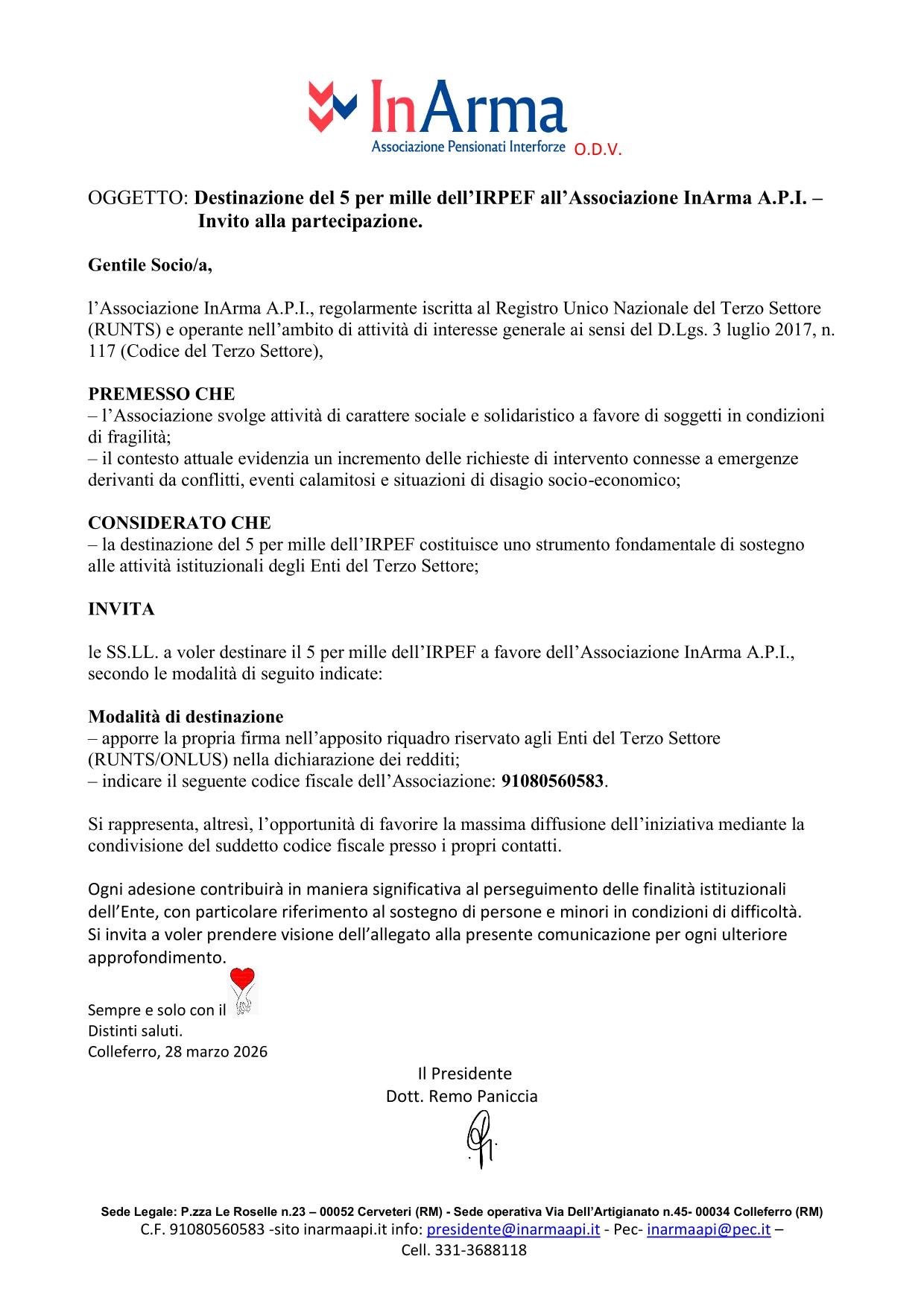 Sai che puoi aiutarci a raccogliere fondi anche con un semplice passaparola? Tramite Whatsapp puoi condividere con amici, parenti o chi vuoi tu, un promemoria con il codice fiscale di InArma A.P.I. Ogni singola firma è importante e può fare la differenza per tanti bambini! (ricordandoci appunto degli aiuti che questa associazione ha dato alle esuli ucraine ospitate dalla Chiesa di Roma San Policarpo nella residenza estiva, trasformata per l’occasione in centro di prima accoglienza.